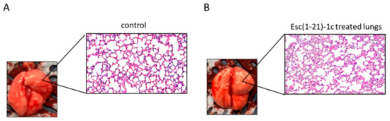 Furthermore, histopathological examination of lung tissue did not reveal significant recruitment of inflammatory cells compared to PBS-treated mice within 48 h from i.t. instillation of Esc(1-21)-1c, in agreement with the absence of macroscopic damage to the lungs (Figure 5).