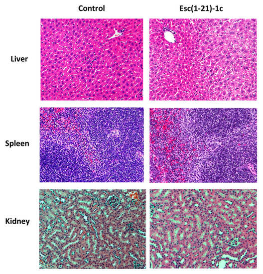 Similarly to what was found for the peptide dosage of 1.5 mg/kg, no alteration in the tissue structure was visible at the level of the liver, spleen, and kidneys after treatment with 7 mg/kg of Esc(1-21)-1c, compared to the control (Figure 6).