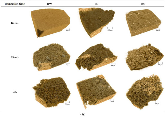 As illustrated in Figure 7B, the colour gradient from light brown to dark brown indicates low to high X-ray absorption. Higher absorption referred to as higher density is mapped as white. Well-distributed, organised white spots were observed in the cross-sectional reconstructed 3D images of 5E and 10E (white circles), and they were especially greater in the 10E formulation. These white spots diminished over time and were absent in the porous structure at 4 h after immersion. These white spots, however, were not observed in the IPM tablet. The detected white spots represented bicarbonate salts in the 5E and 10E formulations, based on the X-ray absorption behaviour of the metal salt [73,74]. Given its mainly density-based contrast, SRXTM is well suited for the detection of voids or pores in the matrix, providing high-resolution images [75,76,77]. For IPM tablets, the difference in density was observed and identified in the outer and inner layers of the tablets. After the tablets were immersed in the media, the surrounding water was ingressed. Subsequently, the tablets gradually expanded and eroded, as internal cracks in the hydrate tablet formed after immersion in the media for 2 and 4 h (white arrows in Figure 7B). The water-soluble components, such as P407 and IBU-P407 eutectic mixtures in the tablets, were dissolved and then released into the medium, resulting in heterogeneous surface roughness on the surface of tablets depending on their distribution [76]. In the cases of 5E and 10E, at the initial stage (15 and 30 min), interconnected pores of various sizes and shapes were observed at the outer layer of tablets. The surrounding gel layer appeared as the pore size diminished, and the microporous structure increased steadily when formulations were immersed in a medium with a higher pH at 2 and 4 h. These characteristics were in accordance with the morphological changes observed during digital microscopy and SEM.