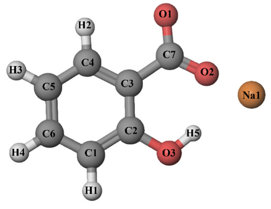In earlier works, interactions between caffeine and benzoic acid derivatives (sodium benzoate, sodium salicylate, salicylic acid, acetylsalicylic acid, etc.) [13,14,15] were investigated, but how these benzoic acid derivatives affect the better solubility of caffeine has not been investigated so far. The mechanism by which these compounds increase the solubility of caffeine in water has remained unknown. The influence of sodium salicylate on the solubility of caffeine has not yet been experimentally determined. Sodium salicylate (Figure 2) (SS) is a non-steroidal anti-inflammatory drug, and it belongs to the derivates of salicylic acid and is used as an analgesic, antipyretic, antioxidant, and antimicrobial drug [16]. In spite of that, salicylate is most frequently used in the food industry as a dietary supplement and preservative. It can also be found in food as a naturally occurring compound [17,18,19].