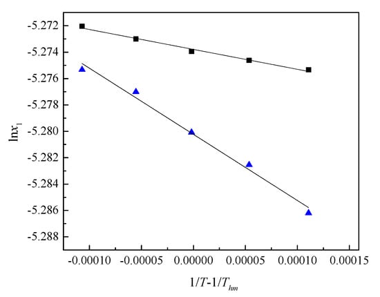 The plot of the natural logarithm of the mole fraction of (■) caffeine in a saturated 0.1 mol∙kg−1 SS aqueous solution and (▲) caffeine in a saturated aqueous solution, lnx1 versus 1/T − 1/Thm.
