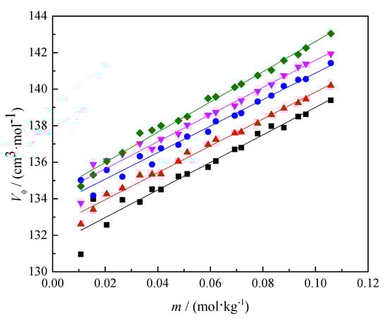 The obtained solution densities were used to calculate the apparent molar volume () of caffeine, from the equation presented in the Supplementary Materials. The calculated values are shown in Table S2. As shown in Figure 4, the caffeine values in 0.1 mol∙kg−1 SS aqueous solutions increased with caffeine molality at all temperatures.