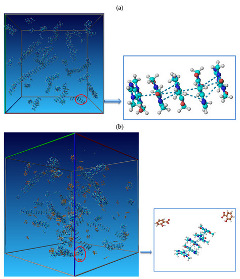 Visual representation obtained from the Yasara Structure program of caffeine organization in aqueous solution (a) and 0.1 mol∙kg−1 SS aqueous solution (b), and blue dashed lines represent π–π interactions between caffeine molecules.