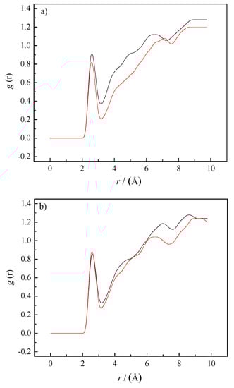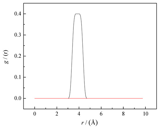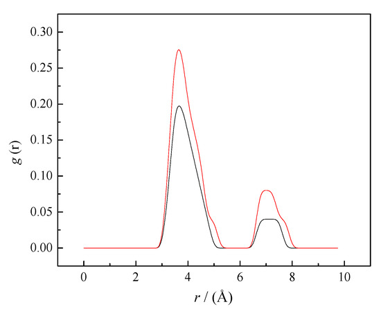 RDFs for the caffeine–caffeine center of mass (black line—aqueous solution, red line—0.1 mol∙kg−1 SS aqueous solution). The lines represent the radial distribution functions obtained from MD simulations’ trajectories.