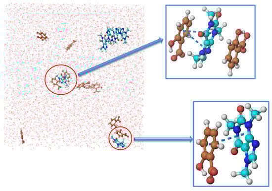 Therefore, we need to analyze what interactions SS can form with the caffeine molecule, increasing its solubility, unlike sodium chloride and sucrose. The logical answer is π–π interactions because both salicylate and caffeine are aromatic compounds. However, we have already discussed (Figure 6b) that salicylate anions are not included in caffeine self-aggregates. Therefore, we set up a new MD simulation with a significantly lower concentration of caffeine (0.06 mol∙kg−1). At this concentration, self-association in pure water does not occur. The concentration of SS was 0.1 mol∙kg−1 and the number of water molecules was 5555. Figure 10 shows a snapshot of the distribution of caffeine and SS molecules after equilibrium (30 ns). It can be seen from the figure that the presence of SS initiated the self-aggregation of caffeine, but that not all molecules are included in the aggregates. However, Figure 10 also shows π–π interactions between caffeine and salicylate molecules. We calculated the radial distribution function concerning the center of masses to better understand the spatial relationship of salicylate and caffeine molecules (see Figure 8). The peak maximum appeared at a distance of 3.86 Å, which is very close to the value of the first peak of the radial distribution of the caffeine–caffeine center of mass (3.65 Å). This means that a molecule of caffeine displaces salicylate during aggregation and takes its place next to another molecule of caffeine. Finally, we can assume the mechanism of salicylate increasing caffeine’s solubility.