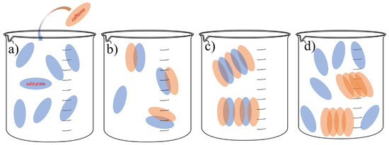Visual representation of the potential role of salicylates in increasing the solubility of caffeine: (a) adding caffeine in SS solution, (b) forming π–π interactions between caffeine and salicylate anions, (c) caffeine and salicylate complexes that provide better solubility of caffeine monomers, and (d) forming caffeine–caffeine complexes through π–π interactions with salicylate anion release.