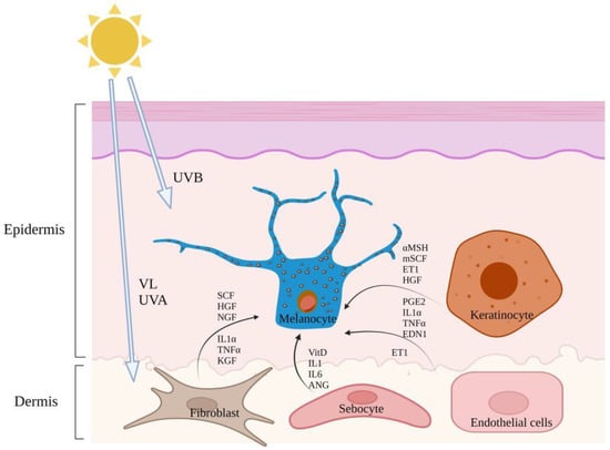 Skin pigmentation is a complicated biological process caused by various intrinsic and extrinsic factors. Extrinsic factors include ultraviolet (UV) exposure, drug effects, and dietary habits, while intrinsic factors are related to regulatory factors produced by cells involved in melanin production. UV solar radiation is important in the melanogenesis of melanocytes. Ultraviolet B (UVB) mainly damages the epidermis and superficial dermis, but ultraviolet A (UVA)/visible light (VL) can penetrate the basal layer and damage the dermis as a whole [10]. Melanin production is associated with the regulation of many paracrine factors. Particularly, as shown in Figure 1, paracrine melanogenic pathways are modulated by keratinocytes, fibroblasts, sebocytes, and endothelial cells secreting cytokines [11]. There are several important melanotropic paracrine cytokine networks between skin cells, including endothelin-1 (EDN-1), the membrane-bound stem cell factor (mSCF), proopiomelanocortin, prostaglandin E2 (PGE2), granulocyte-macrophage colony-stimulating factor, and basic fibroblast growth factor. Growth-regulated oncogene alpha and keratinocyte growth factor (KGF) are involved in keratinocyte/melanocyte interaction, soluble SCF, hepatocyte growth factor (HGF), and KGF are involved in fibroblast/melanocyte interaction [12]. Sebaceous glands can synthesize vitamin D (Vit D) and secrete different cytokines, such as interleukin-6, and growth factors, such as angiopoietin (ANG) and adipokines, which further directly or indirectly regulate melanocyte function [13]. Endothelial cells secrete endothelin-1 (ET-1) to induce the production of melanin. ET-1 can induce the angiogenic response of endothelial cells through the endothelin receptor B(EDNRB) and cooperate with the vascular endothelial growth factor to promote the formation of neovascularization in vivo [14].