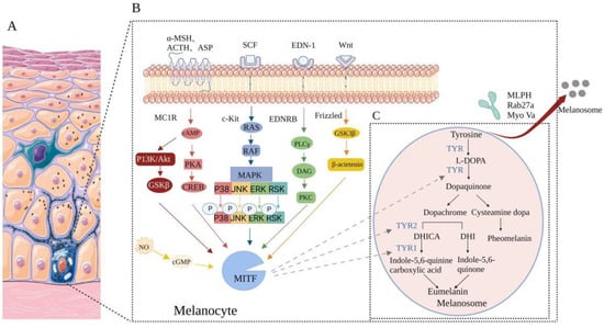 Figure 2. Schematic drawing of melanin synthesis, regulation, and transfer in melanocytes of skin epidermis and skin dullness. (A) Melanin produced by melanocytes is internalized by keratinocytes and then migrates and distributes to the surrounding membrane area, providing pigmentation. (B) Many cytokines activate signaling pathways by interacting with receptors on the melanin membrane and regulate the melanin production process through MITF. (C) Melanin production and transfer process (Created with BioRender.com, accessed on 20 October 2022).