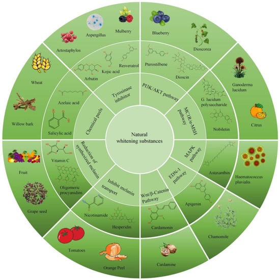 Liu, F., Qu, L., Li, H., He, J., Wang, L., Fang, Y., Yan, X., Yang, Q., Peng, B., Wu, W., Jin, L., & Sun, D. (2022). Advances in Biomedical Functions of Natural Whitening Substances in the Treatment of Skin Pigmentation Diseases. Pharmaceutics, 14(11), 2308. https://doi.org/10.3390/pharmaceutics14112308