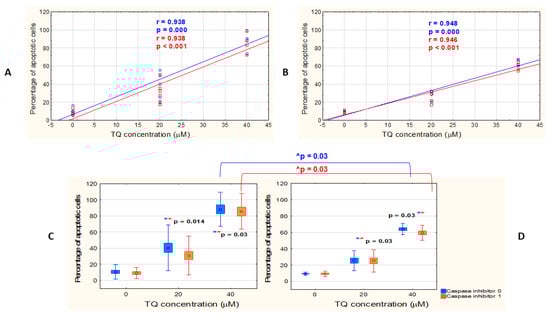 TQ induces apoptosis in A375 and WM9 melanoma cells in a dose-dependent manner. (A–D): Cytometric analysis of apoptosis in two melanoma cell lines: A375 (A,C) and WM9 (B,D) treated for 48 h with different concentrations of free TQ (blue curves and boxes), or with free TQ, following all-caspase inhibitor pretreatment (red curves and boxes). (A,B): Spearman correlation analysis of the data shows the relationship between TQ concentration and percentage of apoptotic cells. Spearman correlation coefficient (r) and p-value were indicated. (C,D): Increase in the percentage of apoptotic cells in relation to DMSO control (presented as 0 μM TQ concentration); * p denotes statistically significant differences between the TQ-treated cells and DMSO control (Mann–Whitney U test); ^ denotes statistically significant differences between the two analyzed cell lines (Mann–Whitney U test). Data are shown as mean ± SD; p < 0.05 was considered statistically significant.