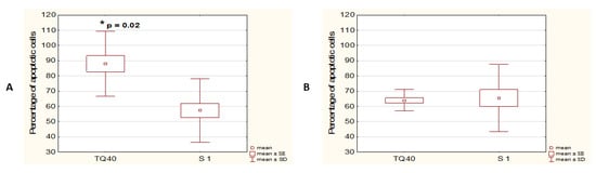 In order to compare the sensitivity of both studied cell lines to TQ with their sensitivity to a known apoptosis stimulator, the cells were treated with 1 μM staurosporine, an inhibitor of protein kinases, for 48 h. A significantly higher percentage of apoptotic cells was shown for the population of the cells treated with 40 μM TQ than for staurosporine-treated cells, in the A375 cell line, but not in WM9 cells (Figure 2A,B).