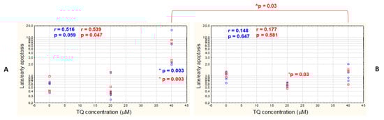 40 μM TQ increases late/early apoptotic ratio in A375 cell line, regardless of the presence or the absence of the all-caspase inhibitor. Cytometric analysis of apoptosis in A375 (A) and WM9 (B) cells incubated with different concentrations of free TQ (blue circles), or with free TQ following all-caspase inhibitor pretreatment (red rectangles). Spearman correlation analysis of the data shows the relationship between TQ concentration and late/early apoptosis ratio. Spearman correlation coefficient (r) and p-value were indicated. Data are presented as mean ± SD; * denotes significant differences in late/early apoptosis between the TQ-treated cells and DMSO control (shown as 0 μM TQ concentration) (Mann–Whitney U test); ^ denotes significant differences between the two analyzed cell lines (Mann–Whitney U test); all the results were considered statistically significant when p < 0.05.
