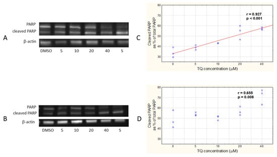 To compare the two tested melanoma cell lines in terms of the presence of apoptosis-associated proteins, we examined the expression of the cleaved PARP, an enzyme characteristic of the late stage of apoptosis, in the cells incubated with 5, 10, 20, and 40 μM TQ, by using Western blot (Figure 4A,C) and subsequent densitometric analysis (Figure 4B,D). A very strong positive relationship between the expression of cleaved PARP and TQ concentration was revealed in A375 cells (Figure 4A) and a strong one in the WM9 cell line (Figure 4B). There were no significant differences in the PARP expression observed between the tested cell lines treated with particular concentrations of TQ.