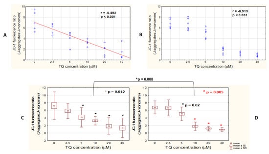 TQ triggers mitochondrial membrane depolarization in A375 and WM9 cells. Spectrofluorometric assessment (JC-1) of the mitochondrial membrane potential (ΔΨm) in A375 (A,C) and WM9 (B,D) melanoma cells treated with different concentrations of free TQ for 48 h. The decrease in ΔΨm is expressed as a drop in J-aggregates/J-monomers ratio. (A,B): Spearman correlation analysis of the data shows the relationship between the concentration of free TQ and ΔΨm. Spearman correlation coefficient (r) and p-value are shown. (C,D): Decrease in ΔΨm in relation to DMSO control (presented as 0 μM TQ concentration). * denotes significant differences between the TQ-treated cells and control (Mann–Whitney U test); ^ denotes significant differences between the two analyzed cell lines (Mann–Whitney U test); data are presented as mean ± SD; all the results were considered statistically significant when p < 0.05.