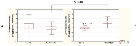 Additionally, when compared to FCCP positive control, the decrease in ΔΨm was shown to be significantly higher in the cells treated with 40 μM TQ than in those treated with 100 μM FCCP in the WM9 cells (Figure 6B). Such a relationship was not observed in the case of the A375 cell line, where no statistically significant difference in ΔΨm between TQ40- and FCCP-treated cells was detected (Figure 6A). However, the observed greater drop in ΔΨm following the incubation with TQ40 than after FCCP administration in WM9, as compared to A375, proved to be the effect of a significantly lower sensitivity to the uncoupler of WM9 cells.