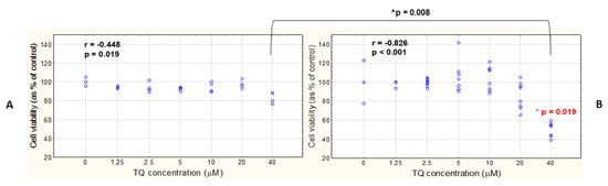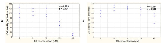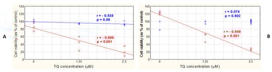 Data are presented as individual samples or mean ± standard deviation. Spearman’s rank correlation coefficient was used to evaluate the associations between TQ concentration and its effects. Differences between the TQ-treated and control groups, as well as differences between the two cell lines studied, were assessed by Mann–Whitney U test. A p-value < 0.05 was considered statistically significant. Statistical analysis was performed with the use of Statistica 13.1 (Statsoft, Round Rock, TX, USA).