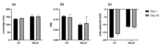 Size (a), size distribution (b) and zeta potential (c) of non-loaded (LP) and thymoquinone-loaded liposomes (TQ-LP) measured on the preparation day (day 1) and following 30 days of storage at 2–8 °C (day 30).
