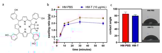 Temoporfin is a hydrophobic molecule. Its chemical structure is shown in Figure 1a. The changes in the weight of the HMs within 1 h of immersion in PBS with and without temoporfin (10 μg/mL) are shown in Figure 1b. All the HMs nearly reached water absorption saturation at 30 min and then plateaued. There was no significant difference in the swelling ratio and contact angle (Figure 1c) between the HM-PBS group and the HM-T group.