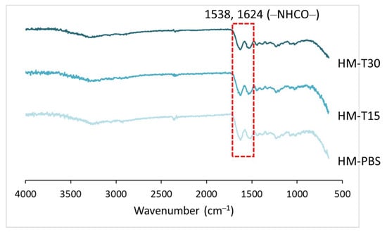 The cross-linking reaction of HM and HM-T specimens were examined using FTIR. The FTIR spectra for the HMs are shown in Figure 2. The amide bond formed via the cross-linking reaction of carboxyl and amine groups by cross-linker EDC had characteristic absorptions at 1538 and 1624 cm−1, indicating that the hydrogels were cross-linked [29,35]. The cross-linking was not affected by temoporfin adsorption and red-light irradiation.