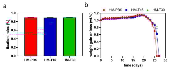 Fixation index (%) reflecting the cross-linking degree of HM, HM-T15, and HM-T30 (n = 9, p > 0.05). (a) Relative long-term immersion demonstrated variation in the weight gain or loss of PBS among the samples (n = 6). (b) One-way ANOVA.