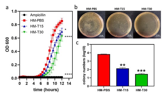 The 24 h bacterial growth curve of HM and HM-T specimens were examined using the kinetic microplate method. The results showed that the HM had no antibacterial effects against S. aureus. The inhibitory activity of temoporfin indicated that increasing the sample release time of HM-T15 and HM-T30 resulted in more evident antibacterial activity at 12 h with varying magnitudes (Figure 4a). However, the final bacterial growth curves of HM-PBS, HM-T15, and HM-T30 all reached the saturation phase at 24 h.