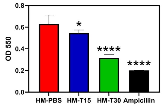 The biofilm-forming ability of S. aureus on HMs is illustrated in Figure 5. Biofilm formation in the HM-T15, HMT30, and ampicillin groups was significantly lower than in the HM-PBS group (p < 0.05). Both HM-T15 and HM-T30 significantly inhibited S. aureus biofilm formation.