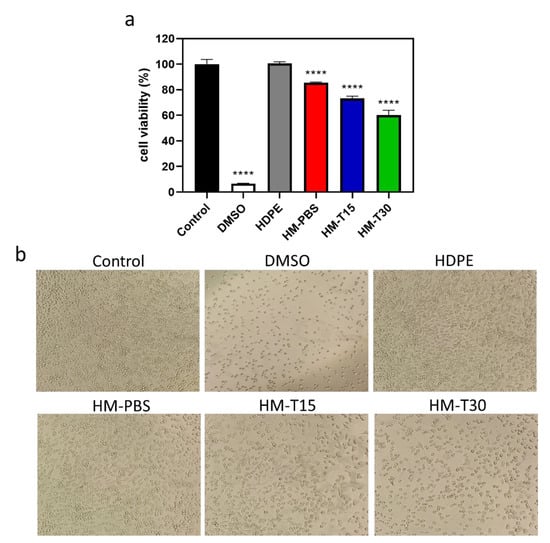 (a) Cell viability in the extracted medium of HM, HM-T15, and HM-T30 through 24 h extraction and 24 h L-929 cell culture (n = 3). One-way ANOVA, **** p < 0.0001 compared with the control group. (b) Images of L-929 cells cultured in HM, and HM-T extract for 3 h, and irradiation for 15, and 30 minutes. The images were photographed after 24 h incubation.
