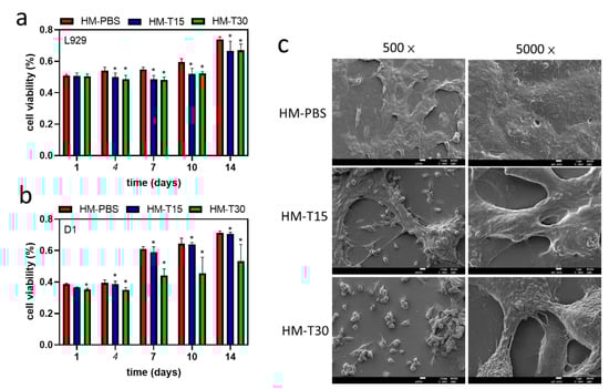 The cell viability of the different HMs attached to D1 cells is illustrated in Figure 7b. After D1 cells were cultured on the surface of the HMs for 14 days, cell viability was found to have increased with culture time in all the groups. The HM and HM-T15 groups showed better cell survival after dark incubation for 14 days compared to the HM-T30 group.