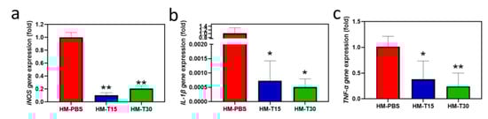Gene expression of pro-inflammatory cytokines (a) iNOS, (b) IL-1β, and (c) TNF-α in L-929 cells after 72 h. One-way ANOVA, * p < 0.05, and ** p < 0.01 compared with the HM group.