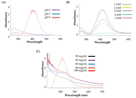 Three trials were conducted at three different pH values (pH 3, pH 7 and pH 9). As shown in Figure 1A, no nanoparticles were formed at both acidic (pH 3) and neutral (pH 7) conditions, as manifested by the lack of color change of the medium and the absence of SPR peak. On the other hand, alkaline pH (pH 9) was found to favor the formation of silver nanoparticles, as indicated by an obvious color change to dark brown/black and the appearance of a SPR peak at around 420 nm (Figure 1A). These results suggest that the synthesis of AgNPs was supported in an alkaline pH, rather than an acidic or neutral pH. Both an acidic and neutral pH might hinder the protonation and deprotonation mechanism [41]; thereby, no reduction of metal into metal nanoparticles would be favored.