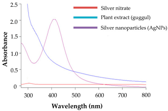 Nanoparticle formulations are greatly affected by different processing parameters, such as pH, the concentration of silver ions, and the concentration of reducing agents [23]. Accordingly, preliminary experiments were conducted to study the impact of various process parameters, including pH, concentration of silver nitrate, and concentration of guggul extract on nanoparticle formation. The formation of AgNPs was confirmed by the appearance of a distinct peak in the UV spectrum at the region of 400–800 nm, resulting from surface plasmon resonance (SPR), a characteristic phenomenon to noble metal nanoparticles [24].