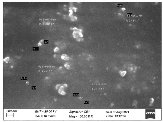 SEM images (Figure 3) were recorded and analyzed for topographical properties of the synthesized G-AgNPs. The size of the particles was in the range of 50–70 nm. The majority of the particles were roughly spherical, with few particles showing an elongated or rod shape. In addition, most of the particles were found to be discrete in nature, while few particles were seen as aggregated, suggesting the efficacy of guggul as a capping/stabilizing agent. Furthermore, the particles showed a non-porous smooth texture without any attached foreign matters.