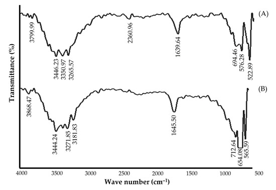 The stability of nanoparticles is an important criterion. To recognize the bioactive molecules capping over the synthesized nanoparticles, FT-IR analysis was conducted for both guggul-capped silver nanoparticles and guggul extract using Bruker FT-IR instrument (Billerica, MA, USA). The FT-IR spectra were recorded within the wave number range 4000 cm−1–400 cm−1 [33].