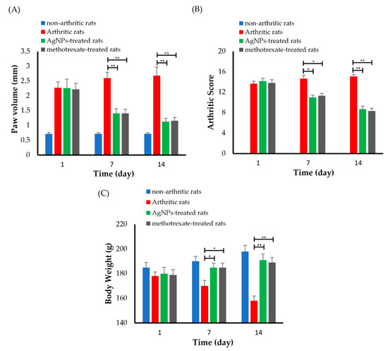 Anti-arthritic activity of silver nanoparticles. (A) Paw volume, (B) arthritic score, and (C) body weight of rats treated with either silver nanoparticles or a reference drug, methotrexate. * p < 0.5 and ** p < 0.01 vs. arthritic rats.