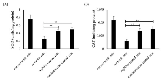 Antioxidant activity of silver nanoparticles. (A) Superoxide dismutase (SOD) enzyme, and (B) catalase (CAT) enzyme in tissue homogenates of arthritic rats treated with either silver nanoparticles or a reference drug, methotrexate. ** p < 0.01 vs. arthritic rats.