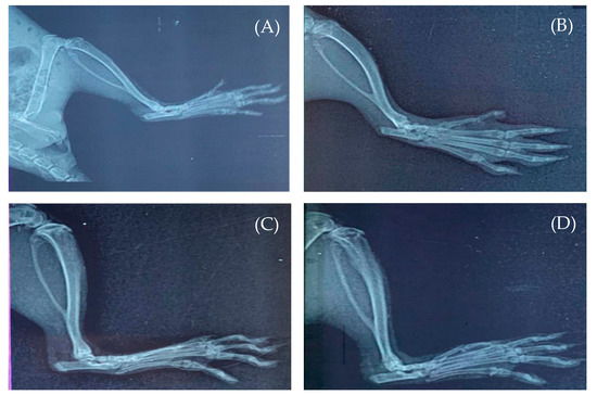 Radiological images of the right ankle joints of (A) normal control rats; (B) arthritic rats; (C) silver nanoparticle-treated rats; and (D) methotrexate-treated rats.