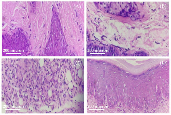 Histopathology of the right paw tissues of (A) normal control rats; (B) arthritic rats; (C) silver nanoparticle-treated rats; and (D) methotrexate-treated rats.