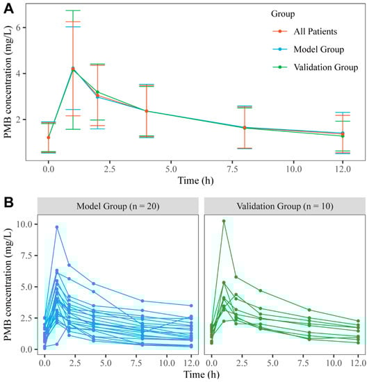 The concentration–time profiles of the model group and validation group. (A) The PMB concentration (arithmetic mean ± SD) versus time profiles of all patients, model group, and validation group. The red lines represent all patients, and the blue lines and green lines represent the model group and validation group, respectively. (B) The concentration–time profiles of the model group (n = 20) and validation group (n = 10). The blue lines and green lines represent the model group and validation group, respectively.