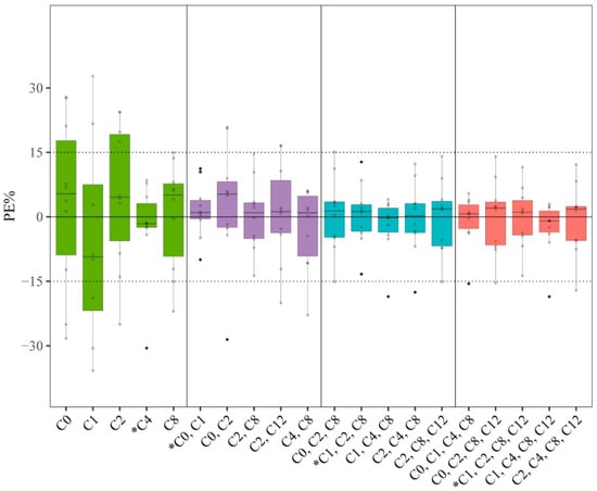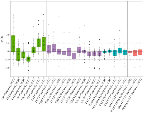 Boxplot of prediction error (PE%) of MLR-based PMB LSSs available in the literature for estimation of PMB AUCpred (Chen et al., 2021 [] and Wang et al., 2020 []). The black solid line and dashed vertical lines represent 0% and ±15% prediction error, respectively. Green, purple, blue, and red boxes represent LSSs consisting of single, two, three, and four concentration–time points, respectively. * Model with the best predictability within the same number of concentration–time points.