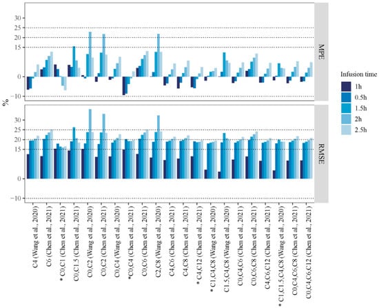 The MPE and the RMSE of the AUCpred under the selected LSSs following the different infusion times (Chen et al., 2021 [] and Wang et al., 2020 []). * Model with the most stable predictive performance.