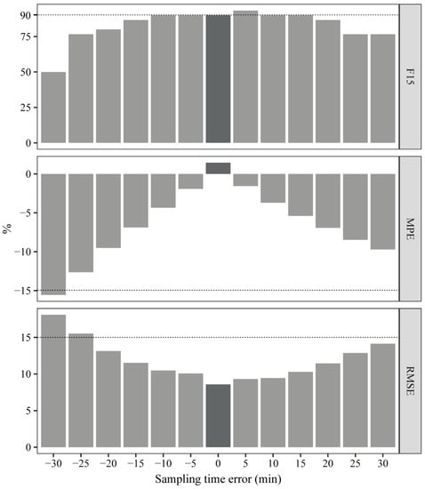 Considering the clinical practice feasibility, the evaluation was performed using the LSS (C0, C1), the most commonly used strategy exhibiting the smallest prediction error at our center. As shown in Figure 5, when the sampling time errors were 0, ±5, ±10, ±15, ±20, ±25, and ±30 min, the MPE, RMSE, and F15 ranged from 1.46% to −15.58%, 8.57% to 18.09%, and 50.00% to 93.33%, respectively, and the R values were all >0.980 (Table S8).