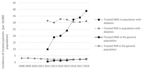 In both the general population and the population with diabetes, treated PDR annual incidence was relatively stable between 2008 and 2018, while treated DME incidence increased from 2012 to 2018 (Figure 1).
