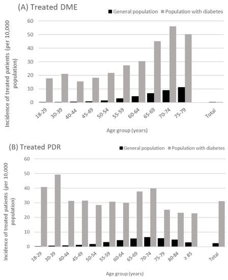 Treated DME (A) and PDR (B) incidence in 2018 per age category in the French general population and in the diabetic population. Abbreviations: DME = diabetic macular edema, PDR = proliferative diabetic retinopathy.
