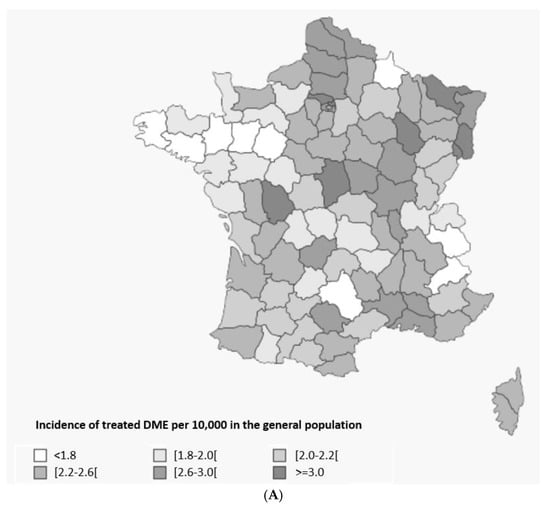 Treated DME and PDR incidence per 10,000 people in the French general population were also analyzed by age (5-year age groups and cumulative age group), region in France, by classification of the patients’ residential areas and by the number of general practitioners and ophthalmologists in patients’ home areas.