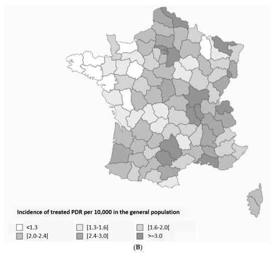 Treated DME (A) and PDR (B) incidence in the general population in 2018 per region in France. Abbreviations: DME = diabetic macular edema, PDR = proliferative diabetic retinopathy. Incidence in the corresponding population in France aged ≥18 years, expressed per 100 inhabitants.