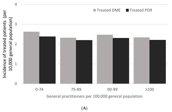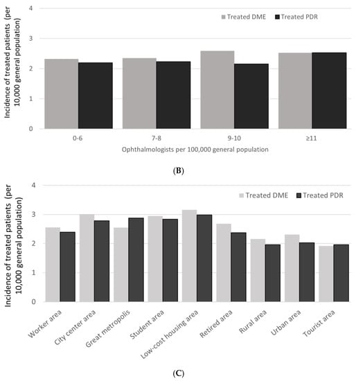 Treated DME and PDR incidence did not appear to depend on the classification of the patient’s type of residence, nor on the density of general practitioners or ophthalmologists in the patient’s area (Figure 4).