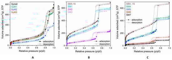 The adsorption–desorption isotherms for the pure and MTZ-immobilized carriers are shown in Figure 1. The isotherms of Syloid based samples (Figure 1A) were of type Iva, according to the IUPAC classification with H2 hysteresis loops, which refers to interconnected networks of pores of different size and shape in the mesoporous range. On the isotherms of SBA-15 based samples, the hysteresis loop (Figure 1B,C) was a typical H1 loop suggesting a narrow distribution of uniform, typically cylindrical pores. The pore structure mainly comprised wider mesopores and macropores, although micropores could also be detected in minor amounts (ca. 0.3 cm3g−1). Due to the differences in the pore structure, the specific surface area (SSA) of the two carriers was significantly different. The SSA of SBA15 (882 m2 g−1) was more than double that of Syloid (368 m2 g−1). Considering the almost identical total pore volume (1.1 cm3g−1) of the two carrier materials, the much higher SSA of SBA15 could be ascribed to its microporosity.