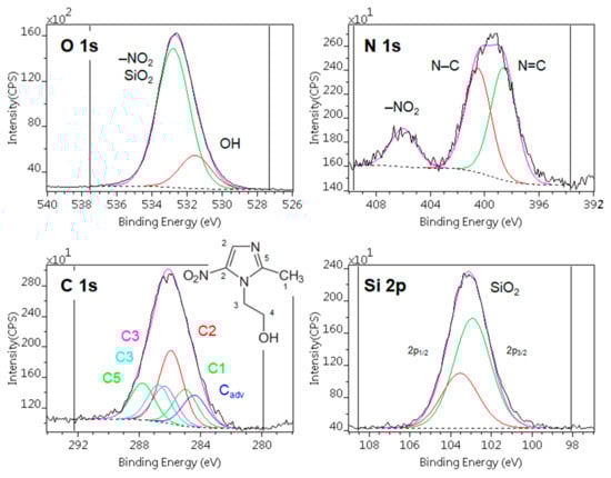 Figure 2 shows typical X-ray photoelectron spectra of the MTZ adsorbed on silica. Besides the components of MTZ and the substrate, only a low level of carbonaceous contamination could be detected. The contamination was also low (lower than usual) on the precursors. After correction [50], their compositions were quite close to the expected theoretical values (Table 4. rows 1–2). The positions of the component lines were in good agreement with the expected chemical states of the materials.