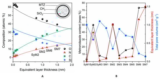 Figure 3. (A): Surface chemical composition (atomic %) of the samples containing MTZ adsorbed on silica, calculated with the infinitely thick homogeneous sample model. Continuous lines are simulated data, while dots are the measured samples. Abscissae are the equivalent layer thickness (nm) of metronidazole, calculated by the layers-on-sphere model. (B): Comparison of the active agent content (mass %) of the samples with the corresponding equivalent layer thickness (nm) and total pore volumes (cm3 g−1).