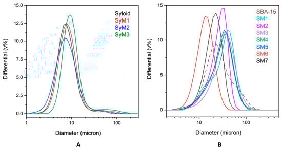 Figure 4. Size distribution of metronidazole–MSM particles ((A): Syloid, (B): SBA-15).